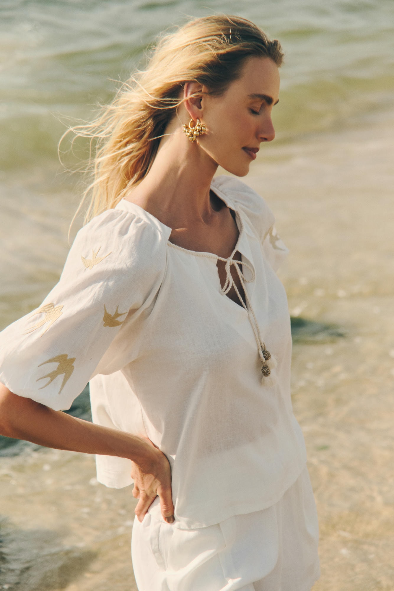 Bata em linho com viscose de toque natural e caimento leve, com modelagem solta que traz conforto e elegância no dia a dia. As mangas bufantes ganham destaque com bordados delicados de andorinhas que trazem um charme artesanal e poético à peça. Como detalhe especial, a bata conta com pingente de miçangas feito à mão que adiciona personalidade e reforça cuidado nos acabamentos.