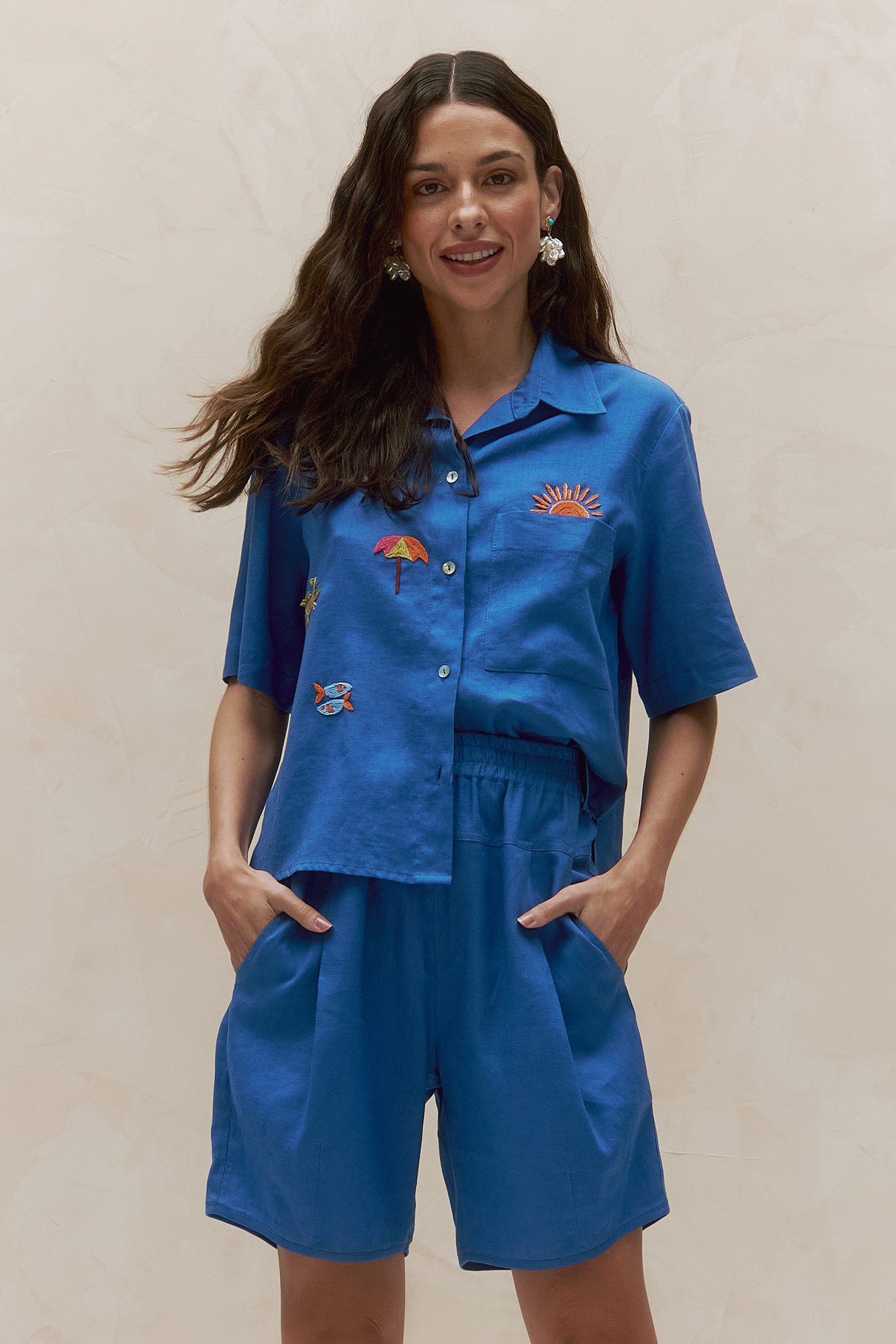 Bermuda jogger, com modelagem despojada e toque leve da cambraia de linho com viscose, que traduz o estilo natural do verão carioca. Uma peça versátil, ideal para compor produções descontraídas com regatas ou camisas leves.
