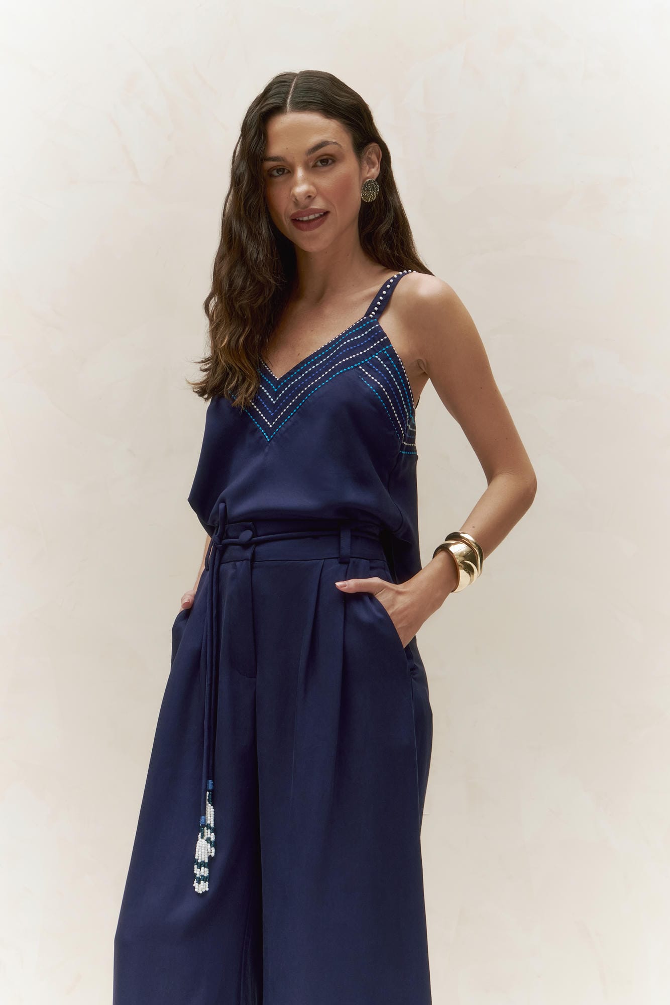 Regata em liocel, com pala bordada, perfeita para combinar com a calça wide leg . Cria um visual sofisticado, leve e elegante, valorizando detalhes artesanais com conforto e estilo.