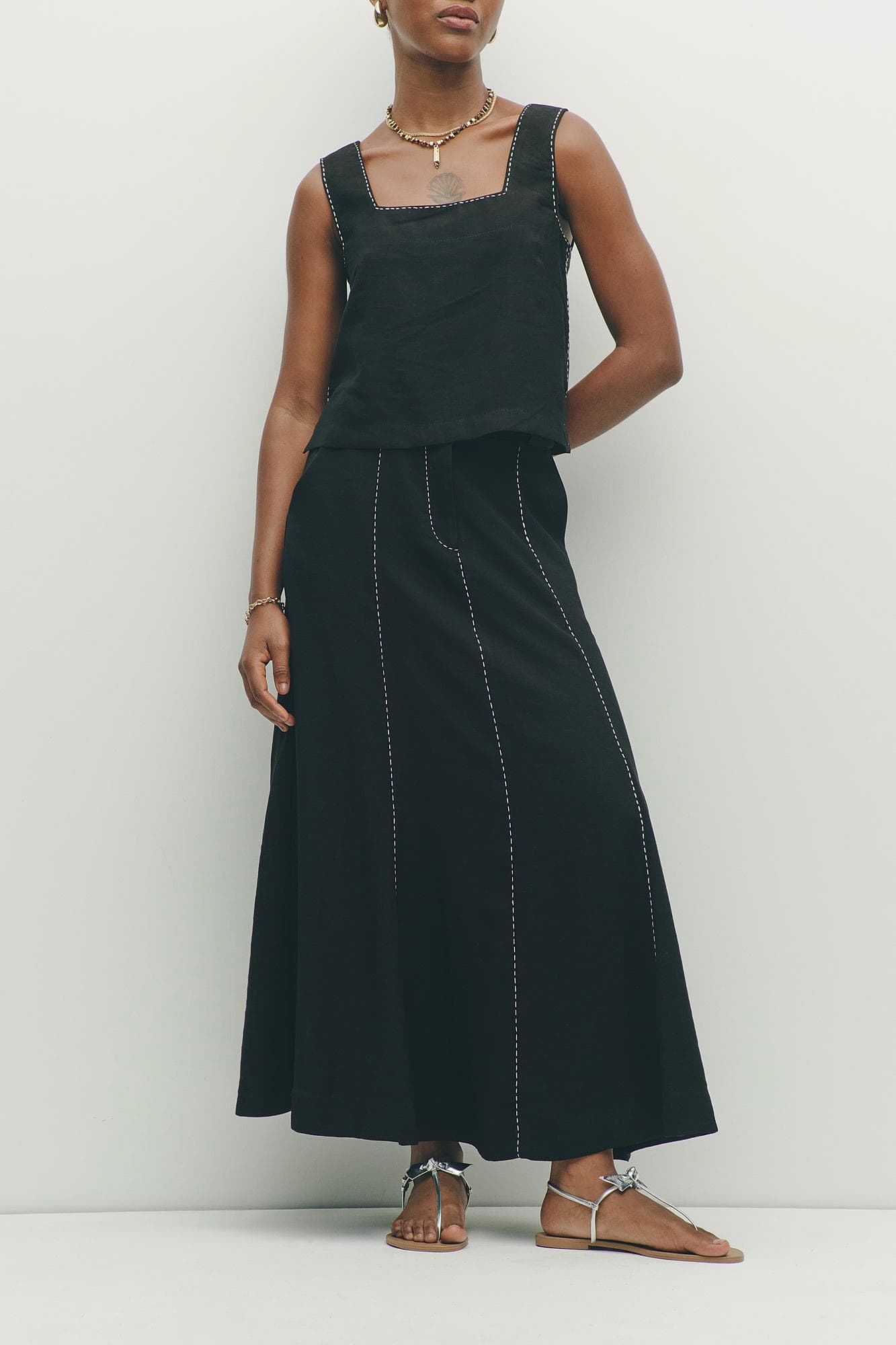 Essa blusa destaca-se pelo decote quadrado, que valoriza o colo de forma elegante e moderna. Os pespontos bordados à mão adicionam um toque artesanal, realçando o visual.