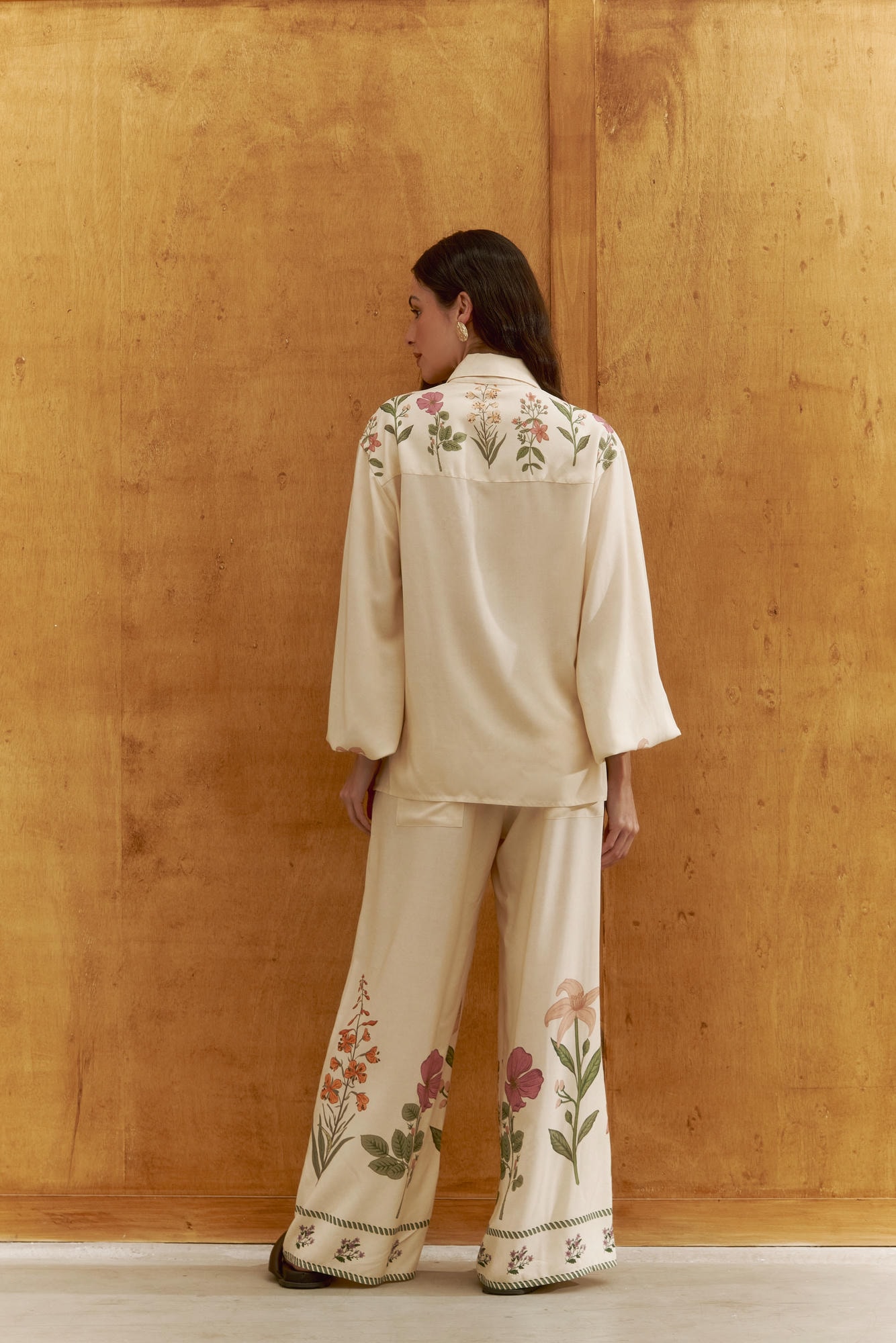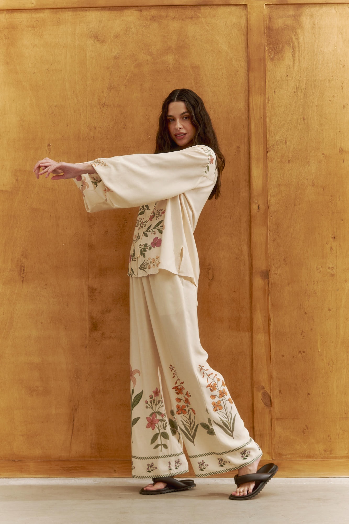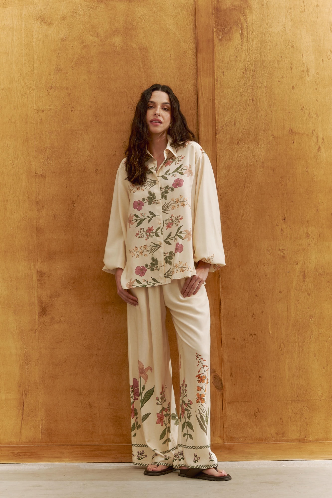 Pantalona com elástico, confeccionada em estampa localizada exclusiva, cria uma proposta elegante e descontraída. Possui modelagem solta e caimento fluido que valoriza o movimento. Ideal para compor looks casuais com charme ou coordenados sofisticados em conjunto.