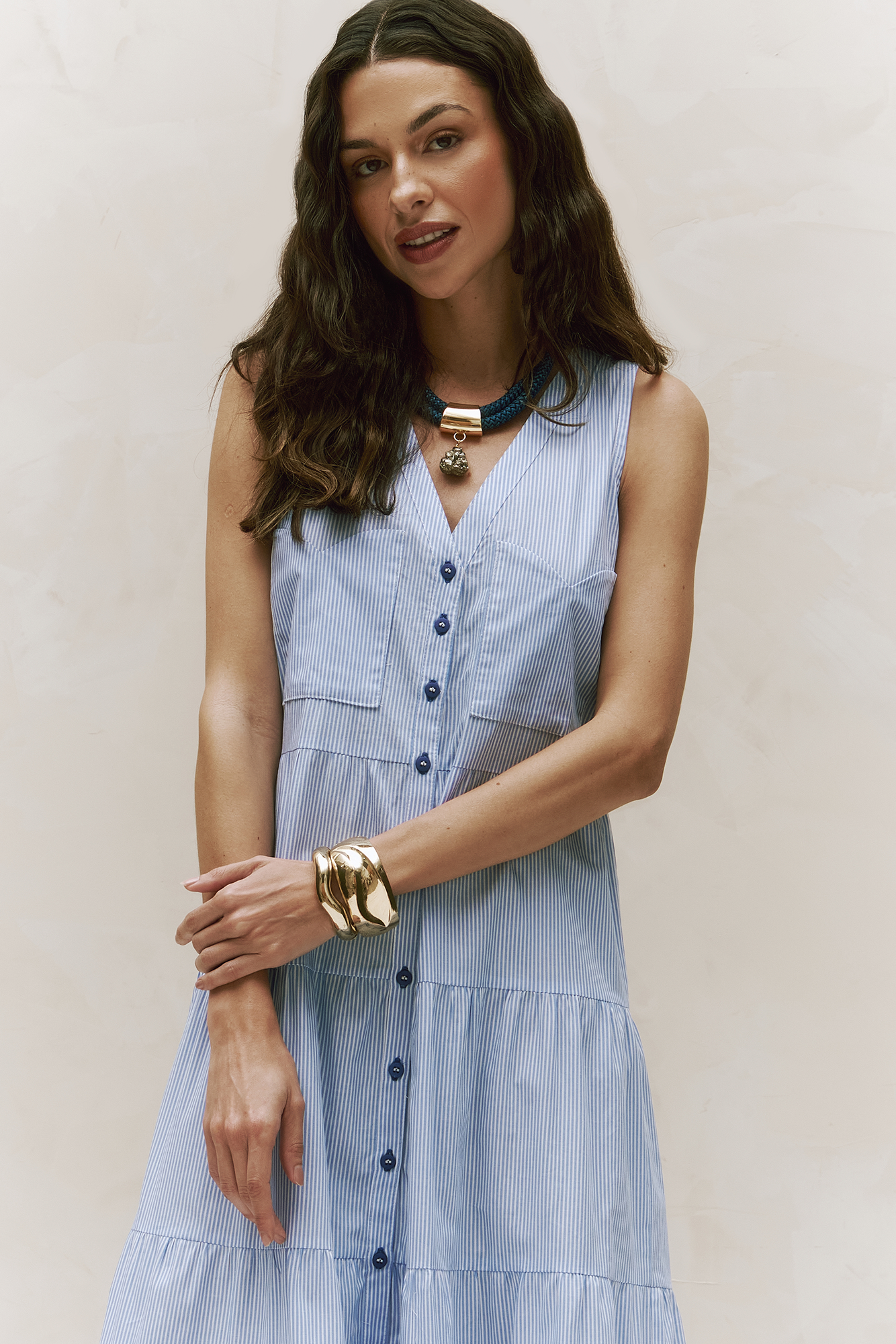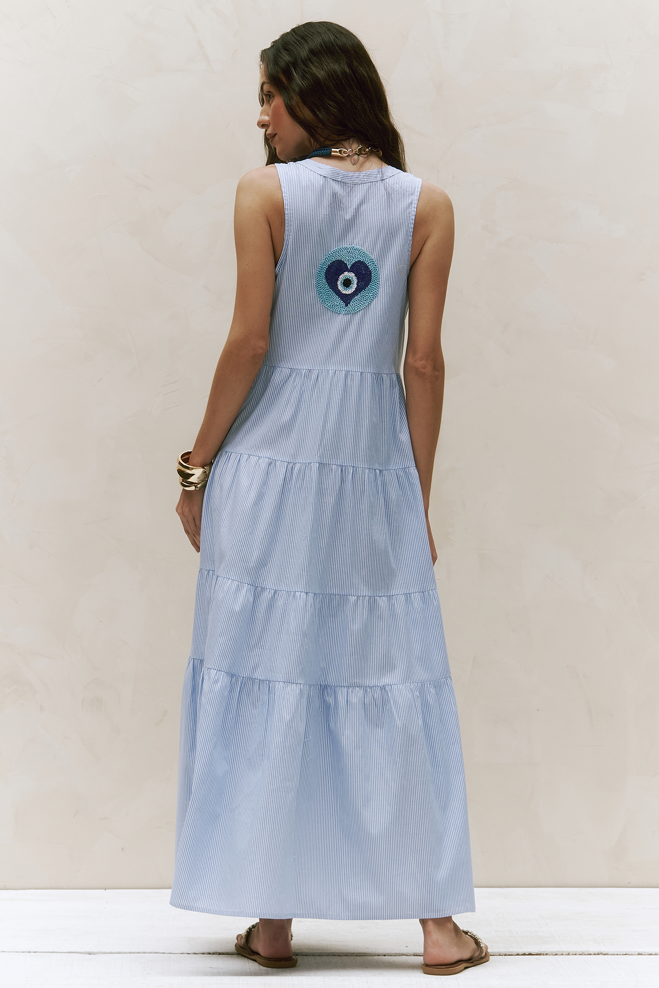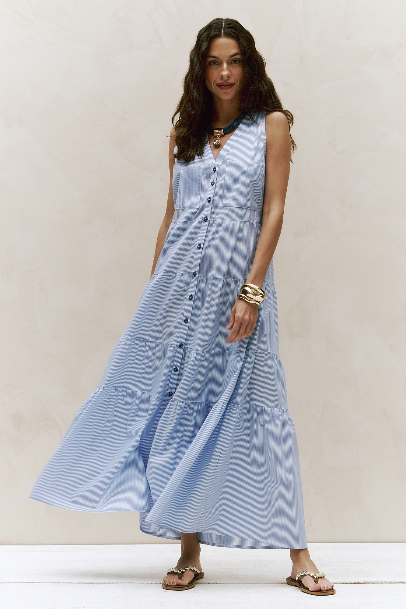Vestido longo em algodão leve, perfeito para o verão. Com inspiração Navy, trás frescor e elegância descontraída.Uma peça romântica que combina a delicadeza do bordado artesanal com um toque casual e elegante.