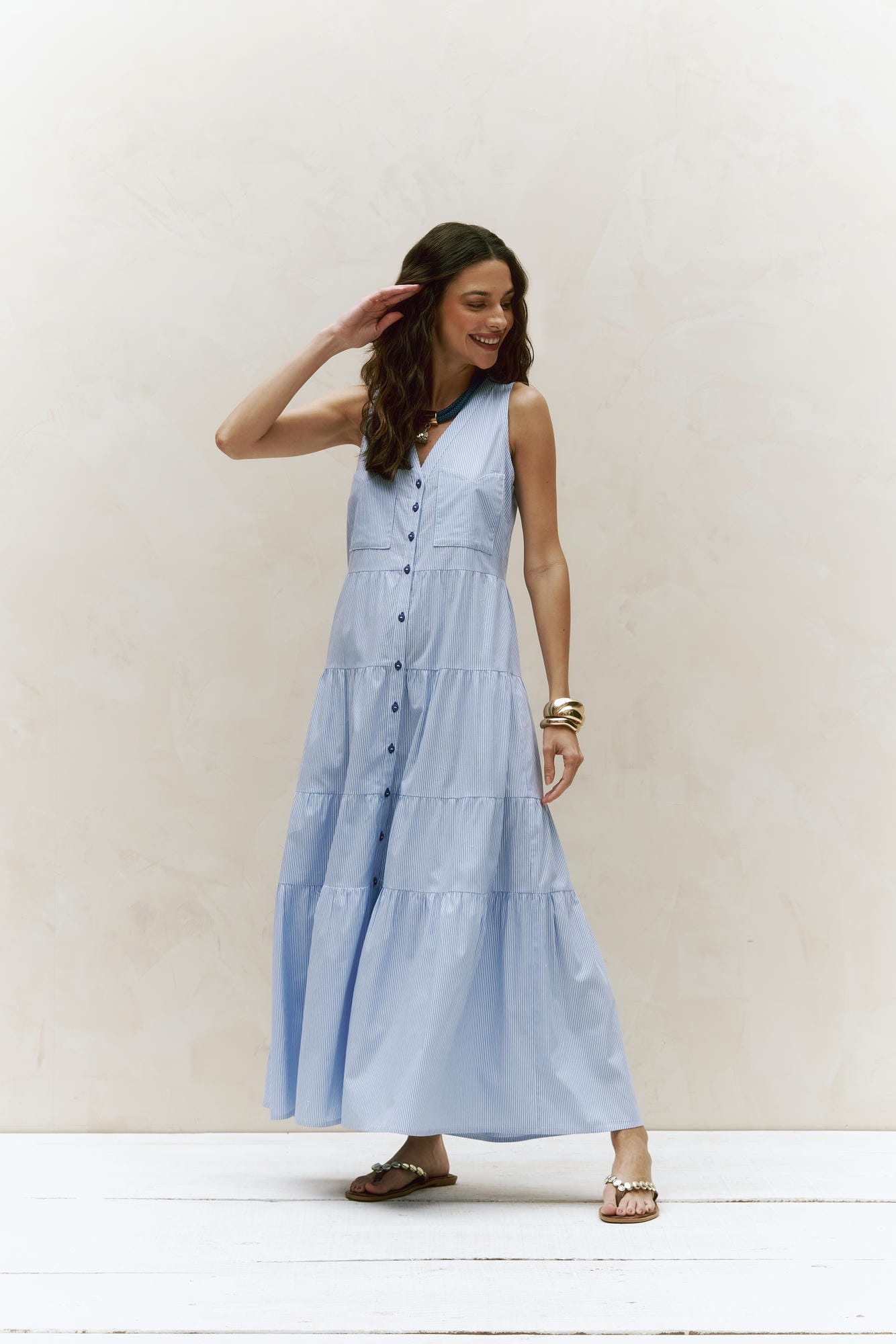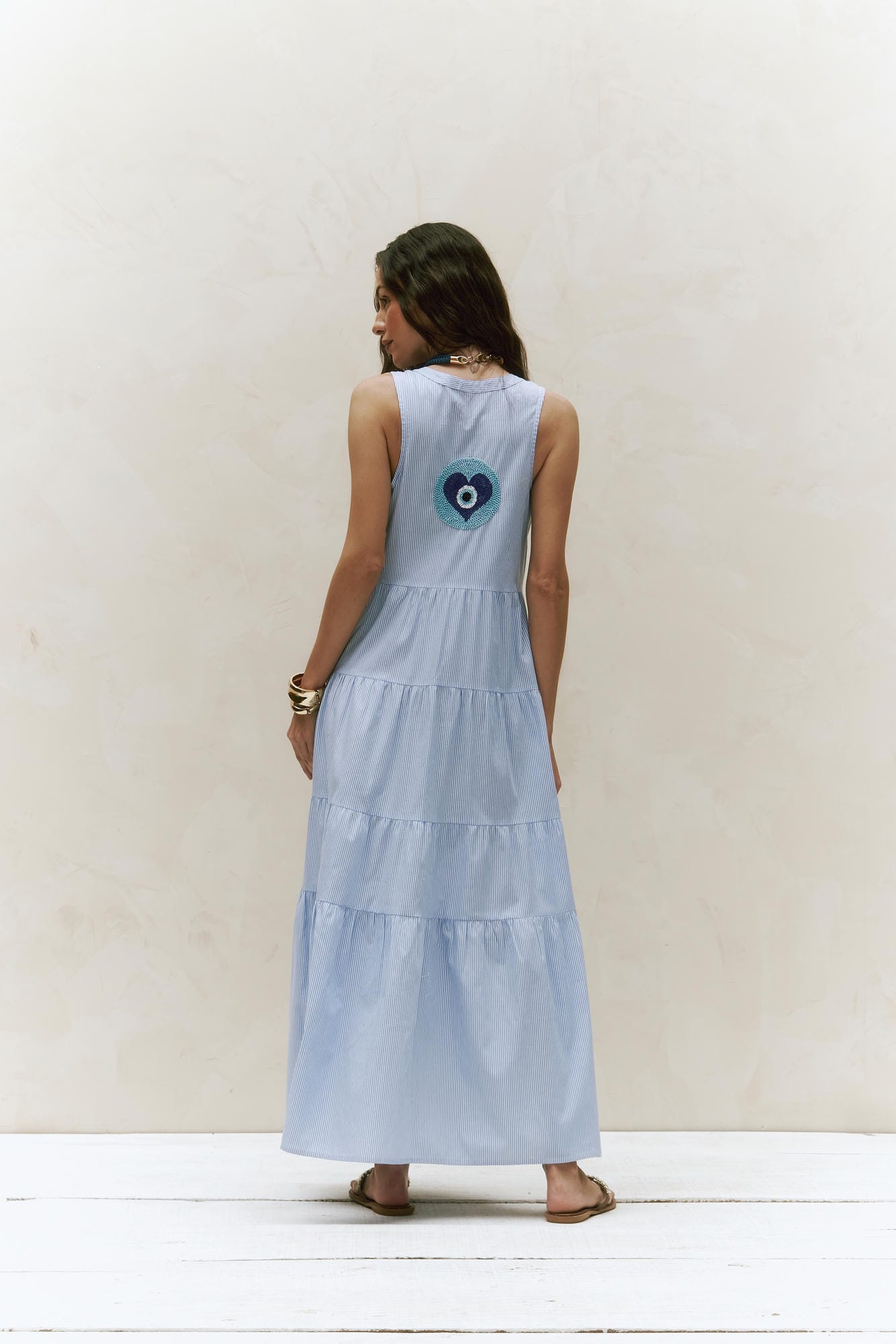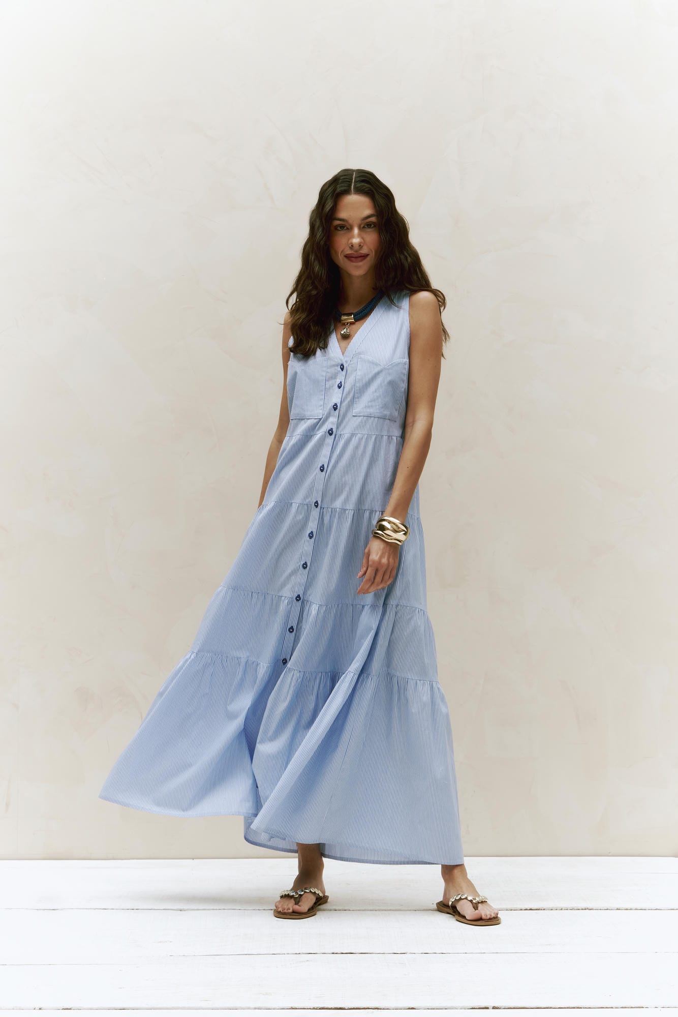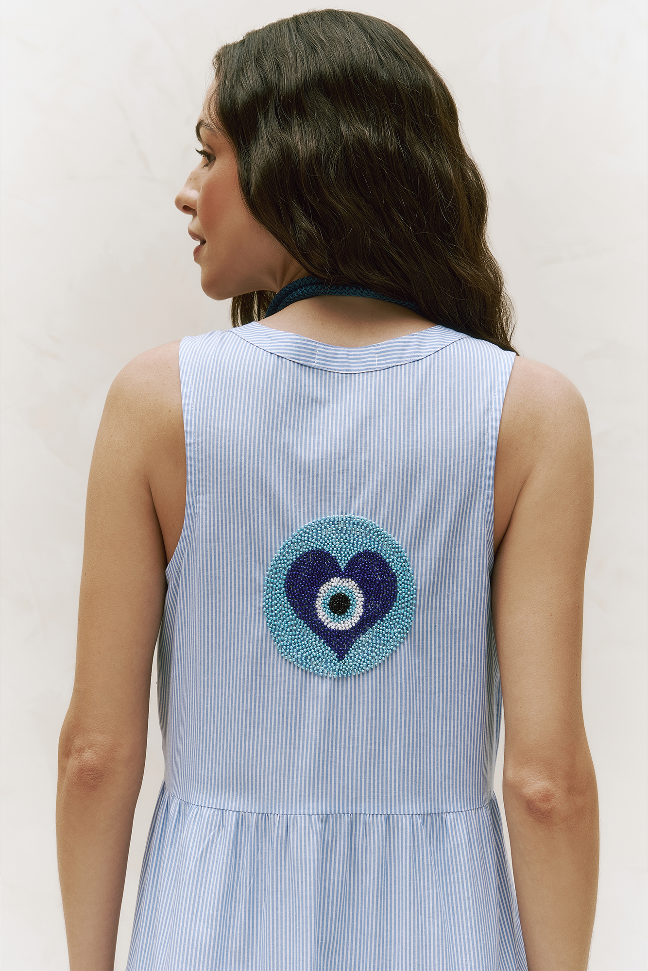 Vestido longo em algodão leve, perfeito para o verão. Com inspiração Navy, trás frescor e elegância descontraída.Uma peça romântica que combina a delicadeza do bordado artesanal com um toque casual e elegante.
