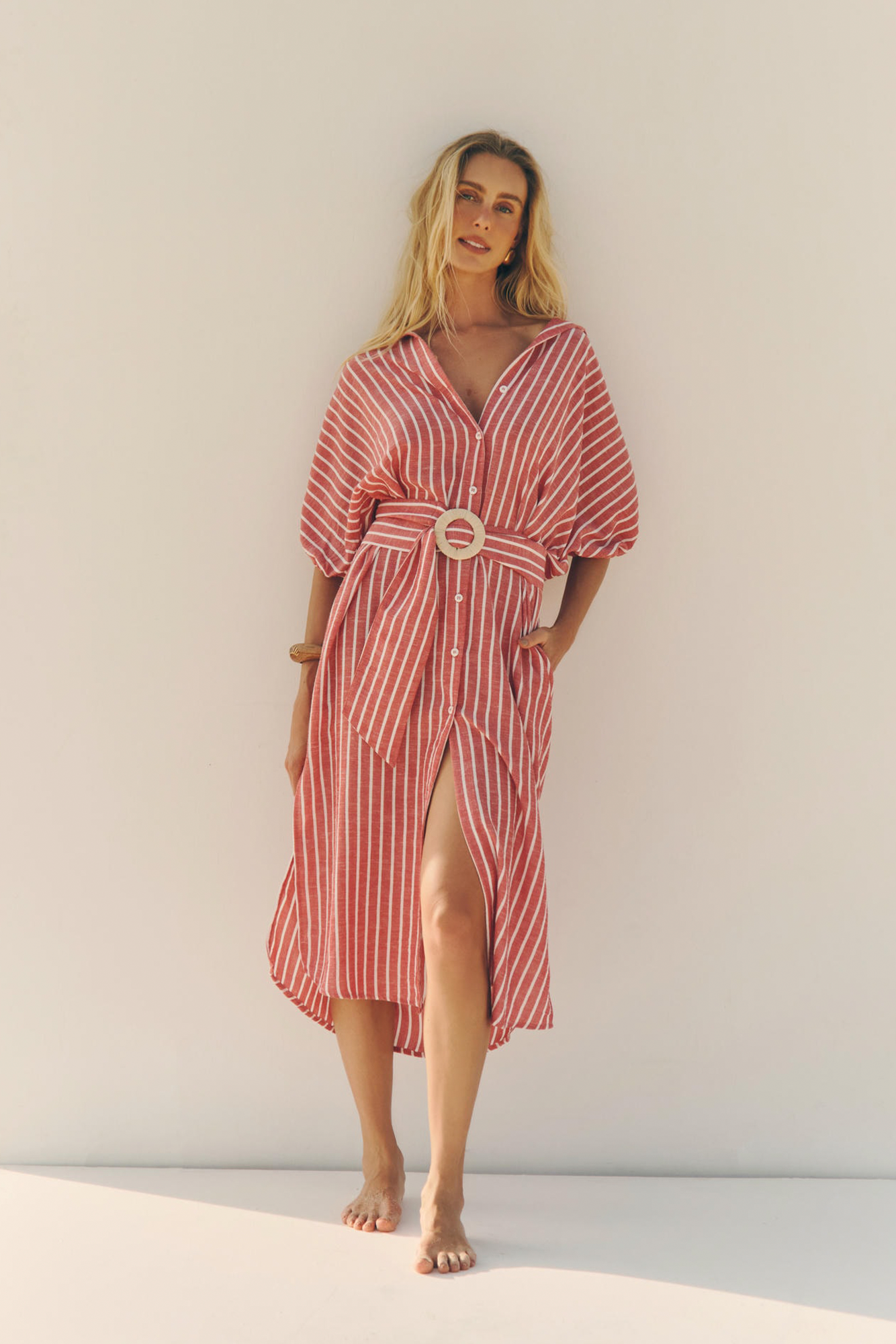 Chemise listrada de caimento leve e elegante, com bordado manual de búzios aplicado no ombro, que traz um toque artesanal e sofisticado à peça. Acompanha cinto com fivela de palha, reforçando o mood natural e contemporâneo do design. Versátil, pode ser usada de diversas formas: aberta com short e top, como saída de praia ou fechada como vestido, permitindo múltiplas composições para diferentes ocasiões. Disponível também na cor azul. Comprimento tamanho p- 1,30cm.