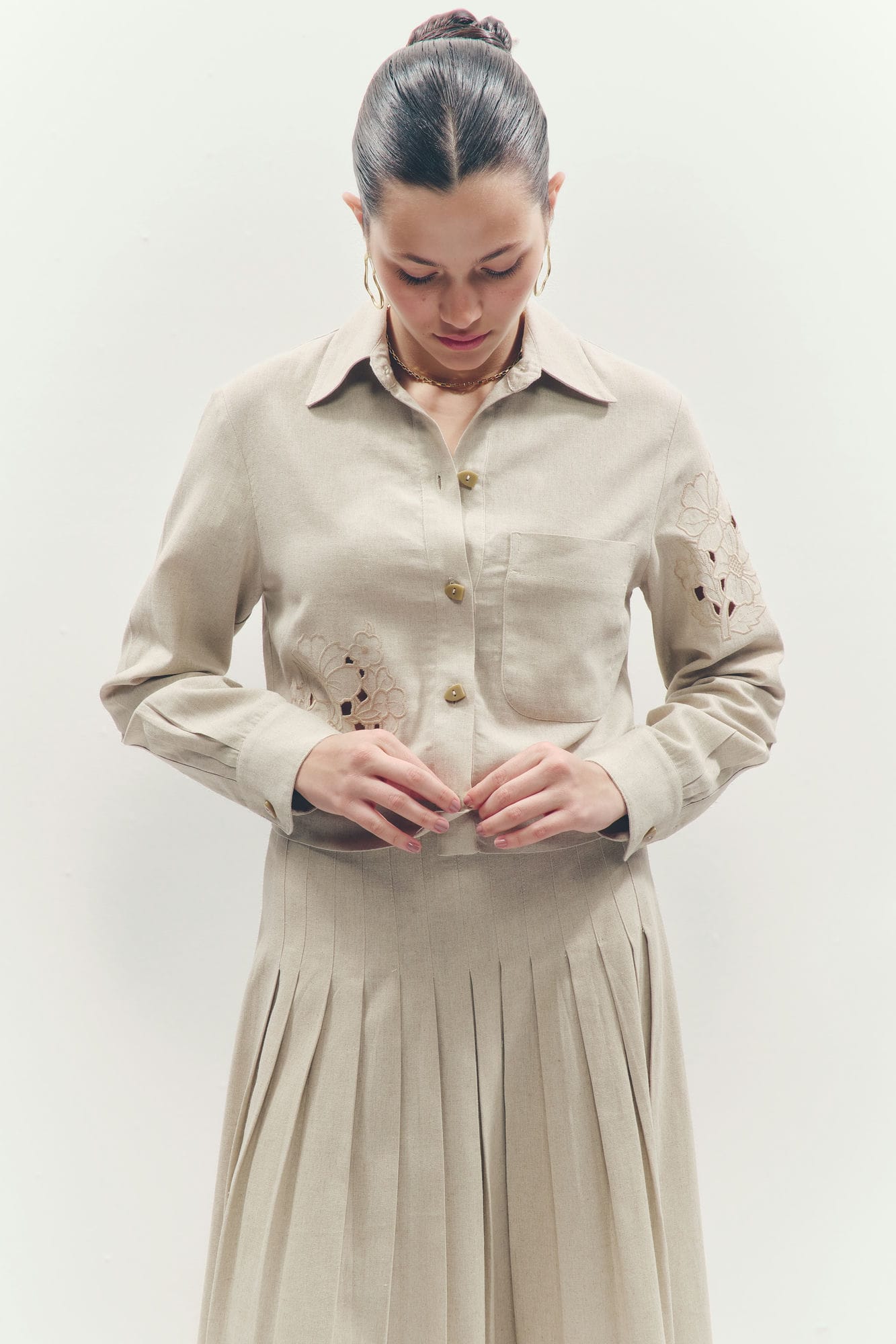 A Jaqueta Encontros é uma peça que ultrapassa qualquer tipo de tendência tornando-se indispensável no guarda-roupa feminino. Feita em linho com viscose e com um rico bordado rechilieur, é uma peça essencial em dias mais frescos.