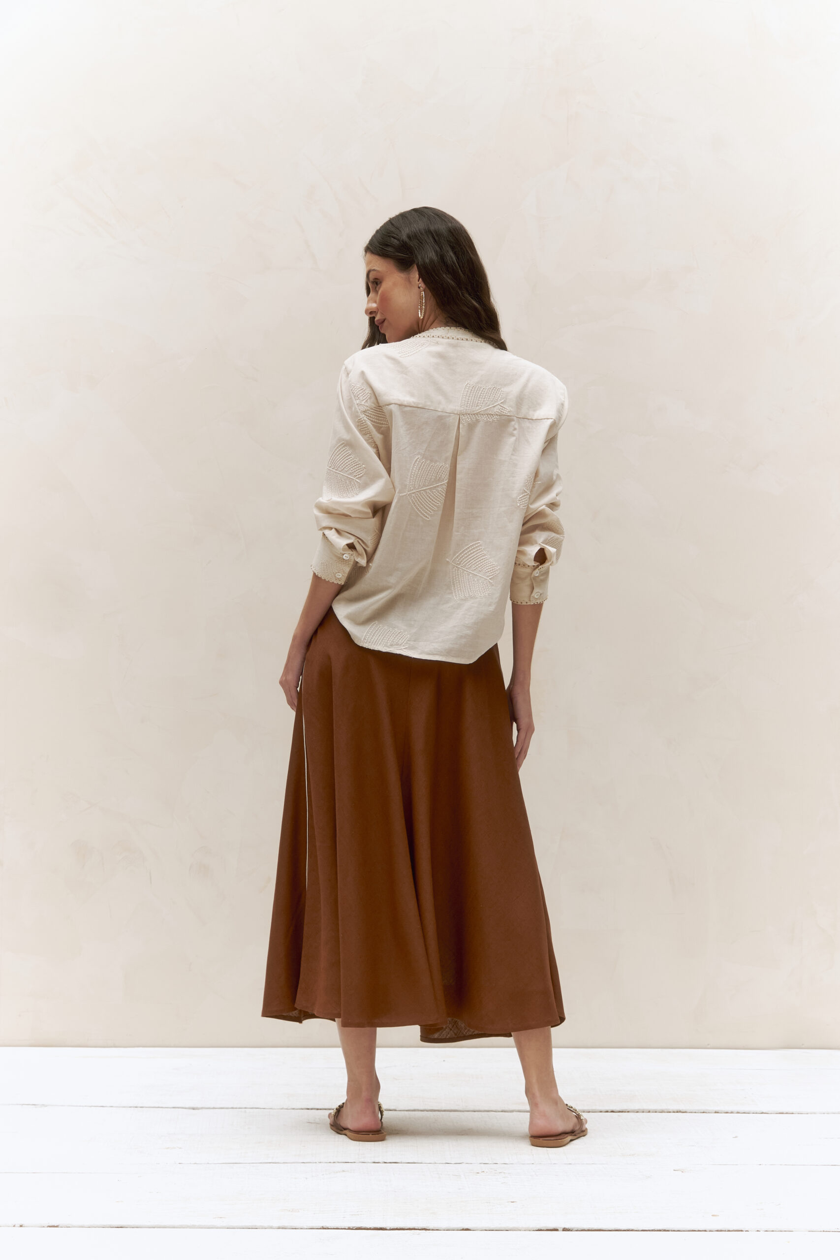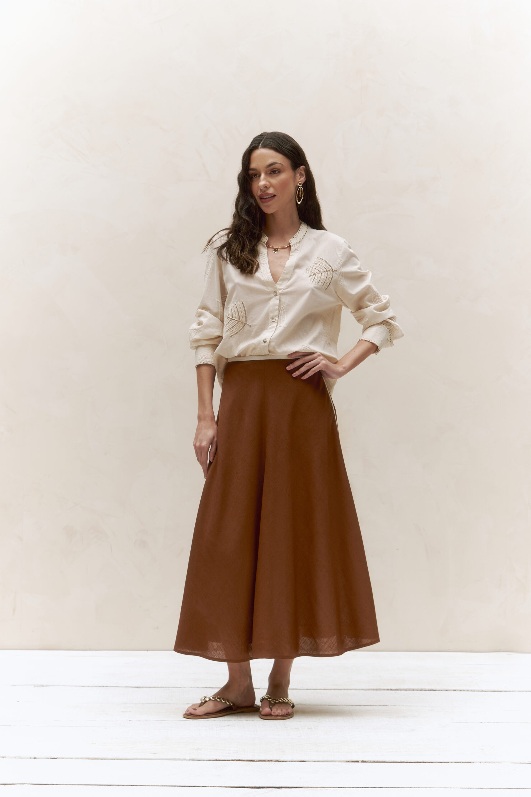 Saia midi em linho com viscose, de caimento fluido e movimento natural.O detalhe de vivo contrastante adiciona um toque moderno à peça.