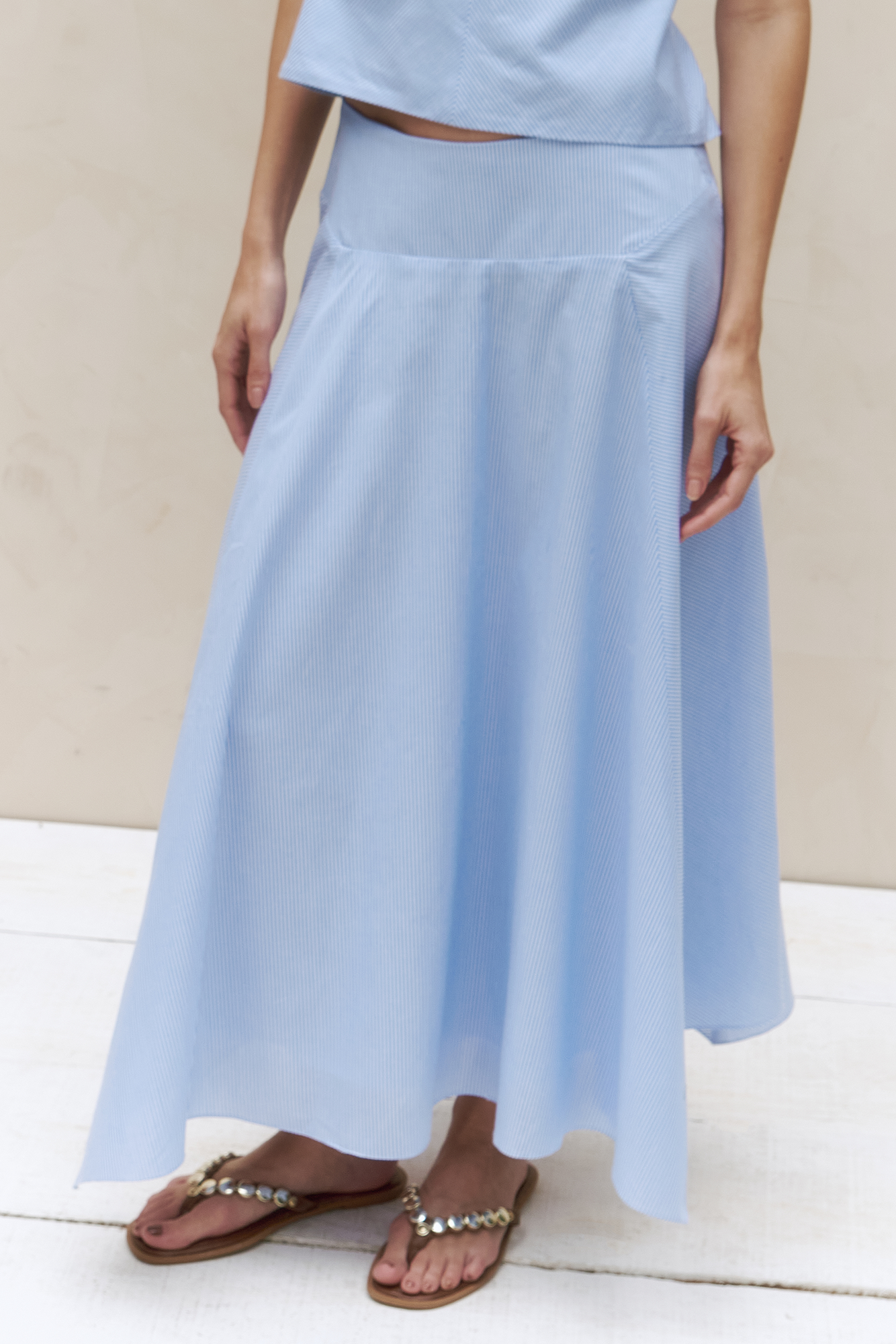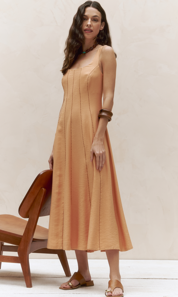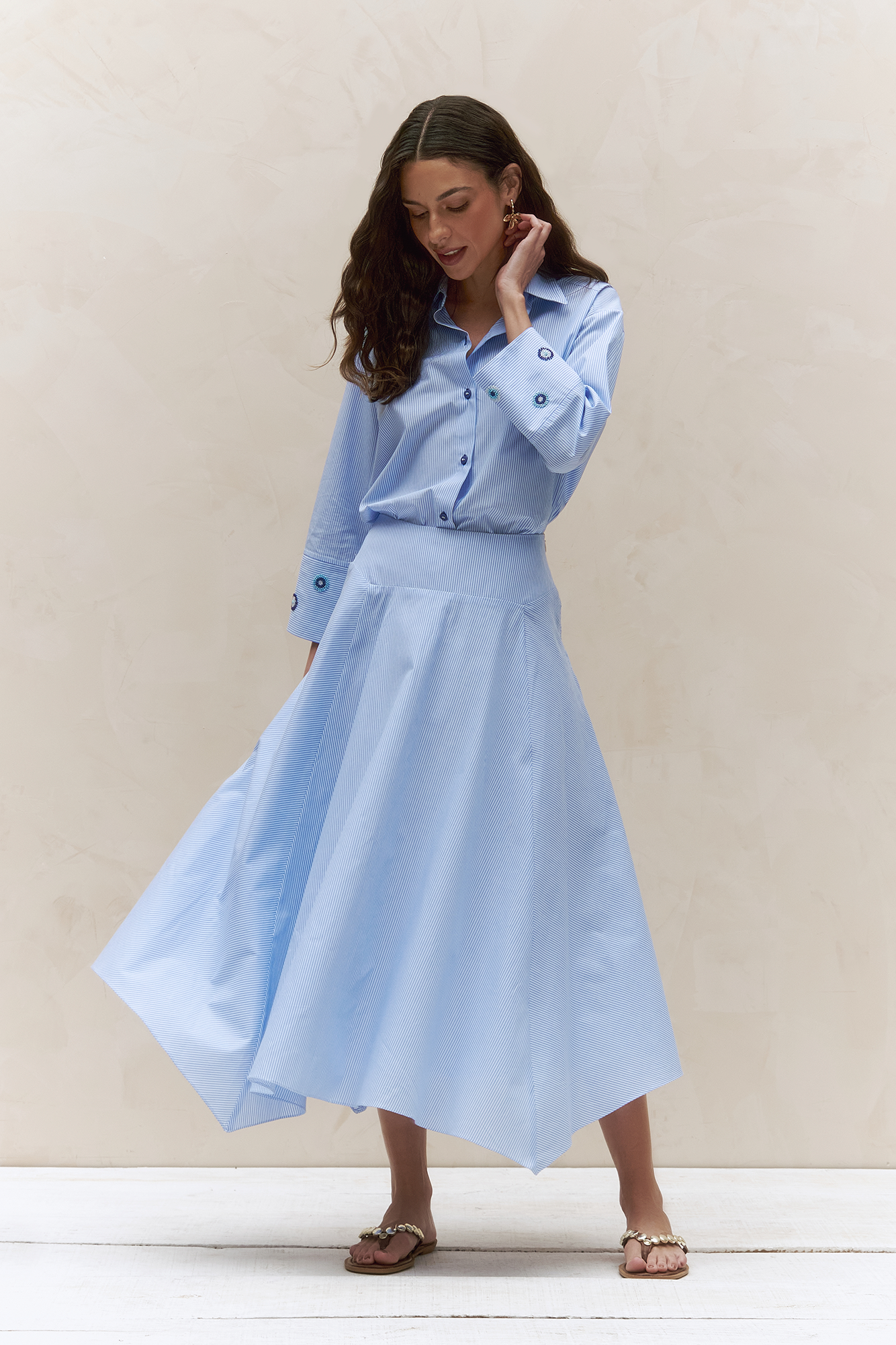Saia listrada com pala estruturada, que destaca a cintura com delicadeza. Os recortes em bicos adicionam movimento criando uma peça leve, moderna e cheia de personalidade.