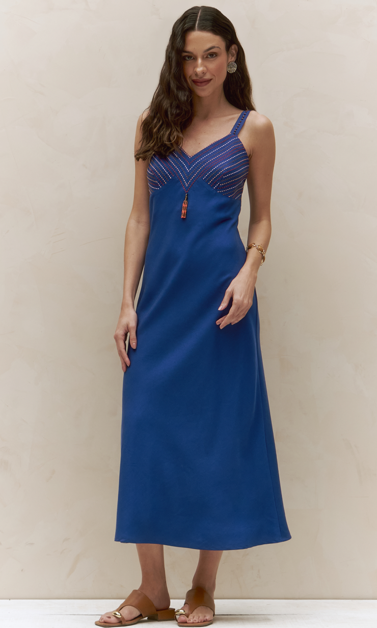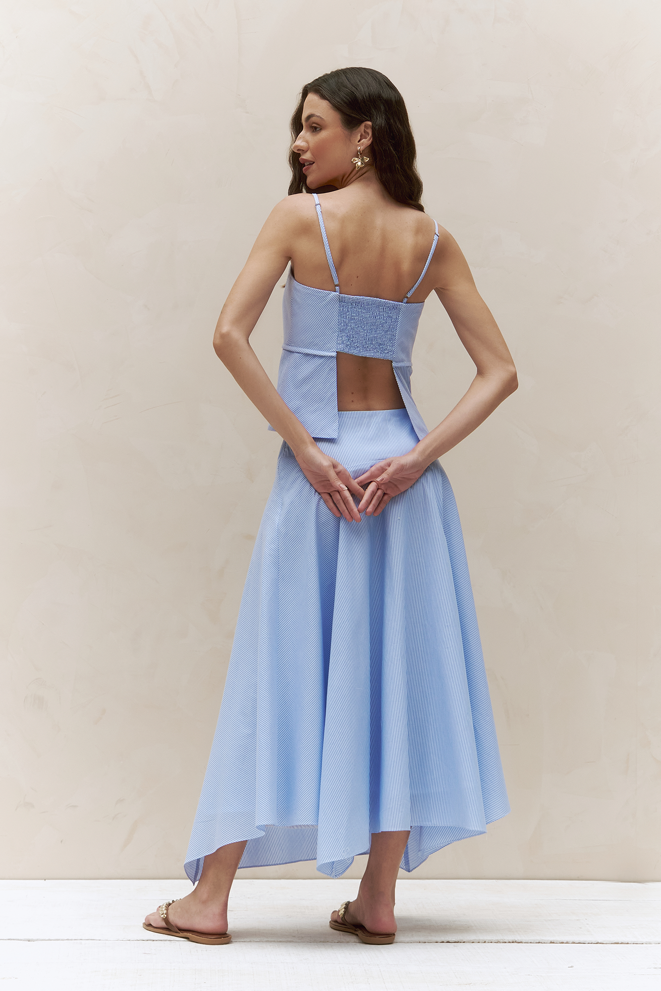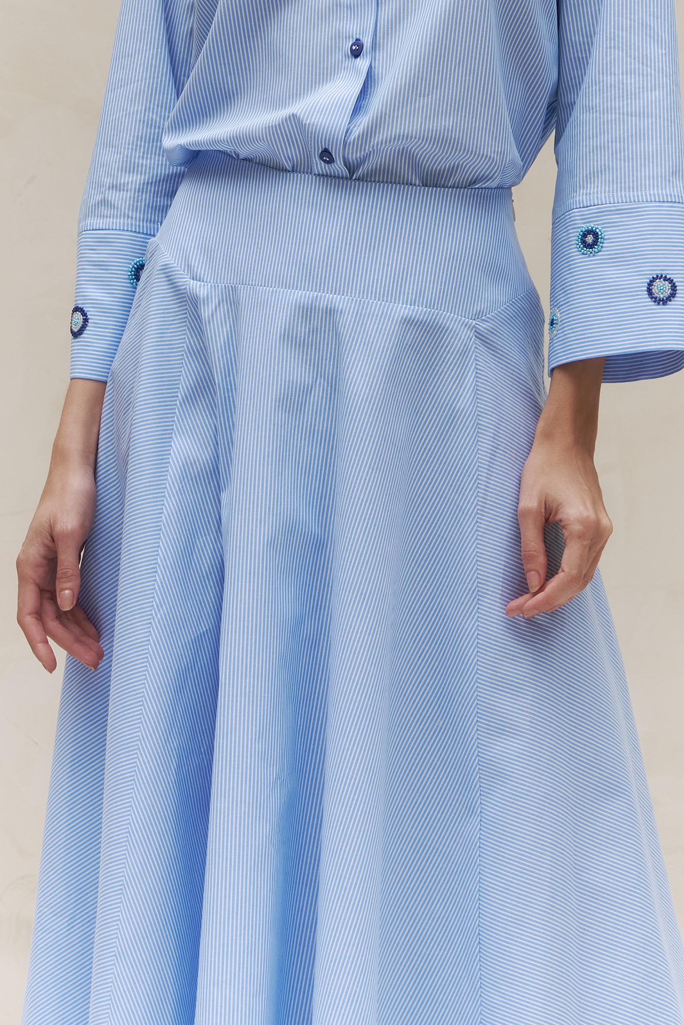 Saia listrada com pala estruturada, que destaca a cintura com delicadeza. Os recortes em bicos adicionam movimento criando uma peça leve, moderna e cheia de personalidade.