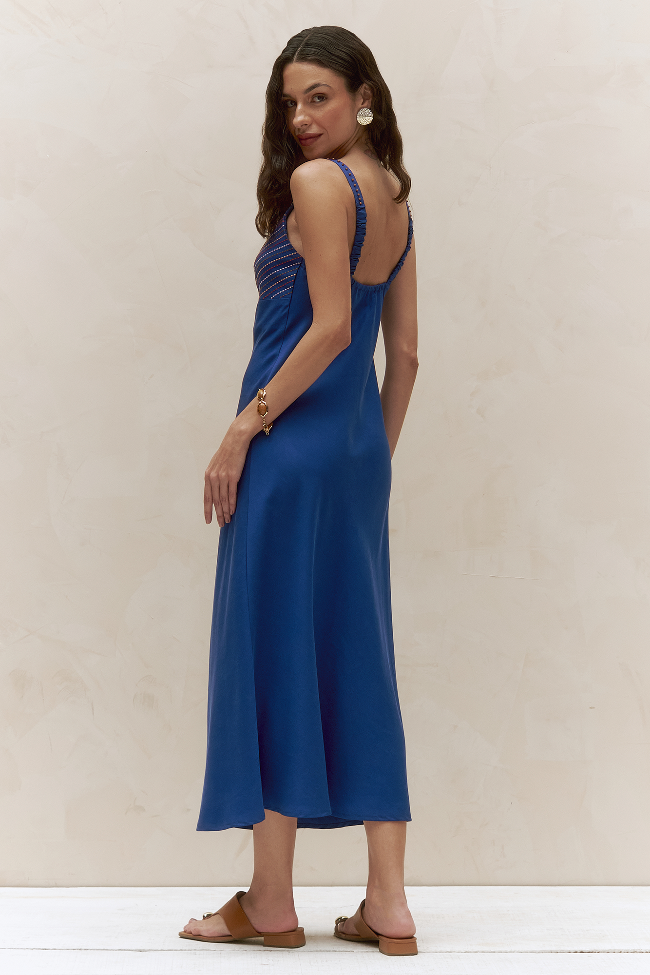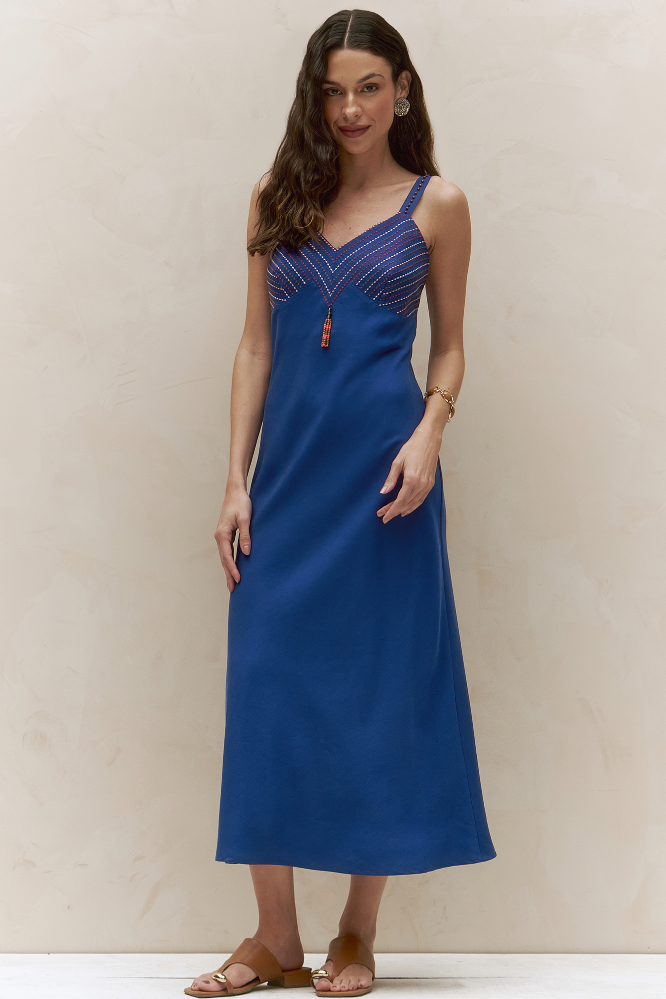 Sleep dress em liocel, com pala bordada, alças delicadamente decoradas com miçangas e pingente opcional. Leve, sofisticado e romântico, ideal para momentos de conforto com um toque artesanal elegante. Disponível também na cor Azul Noite.