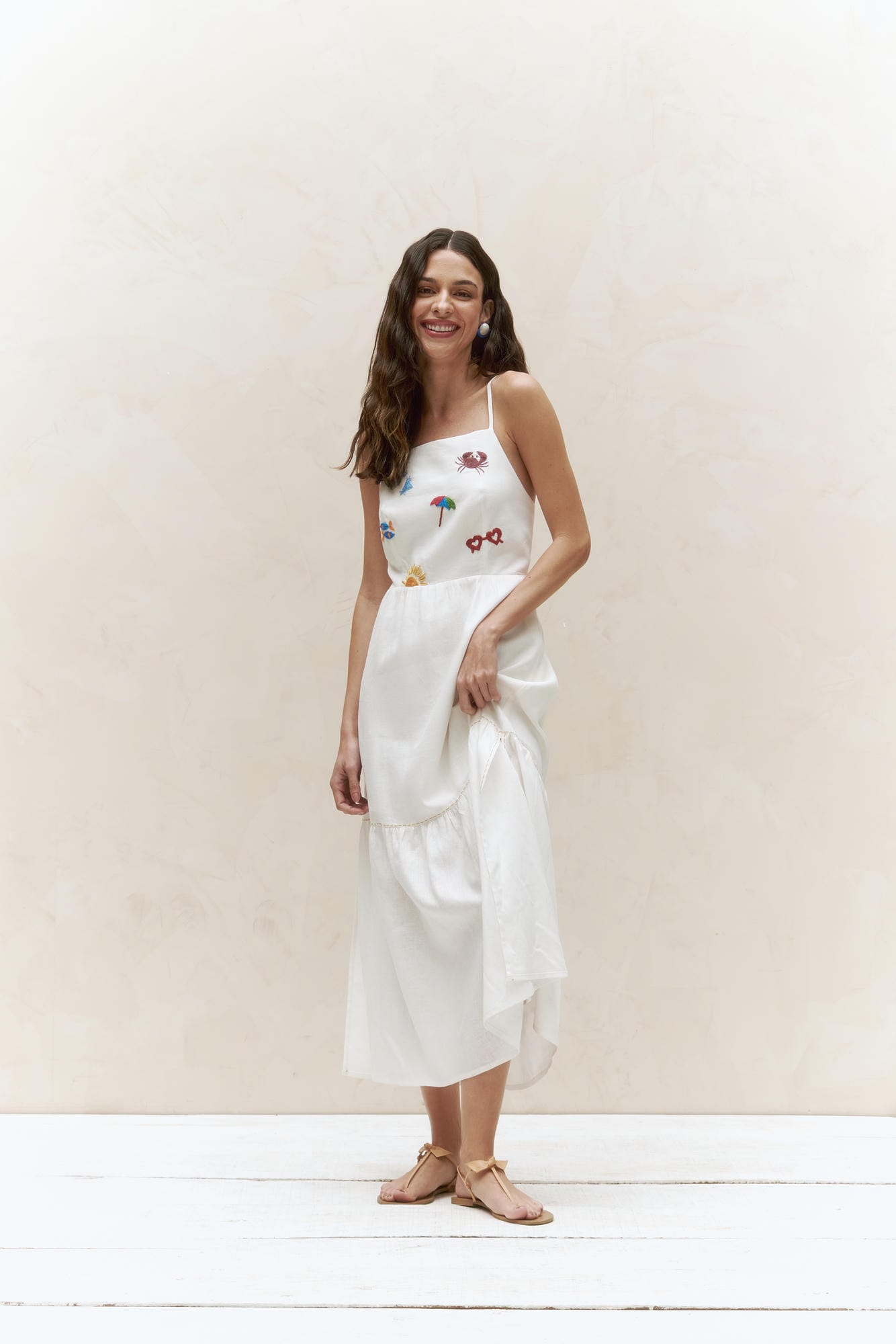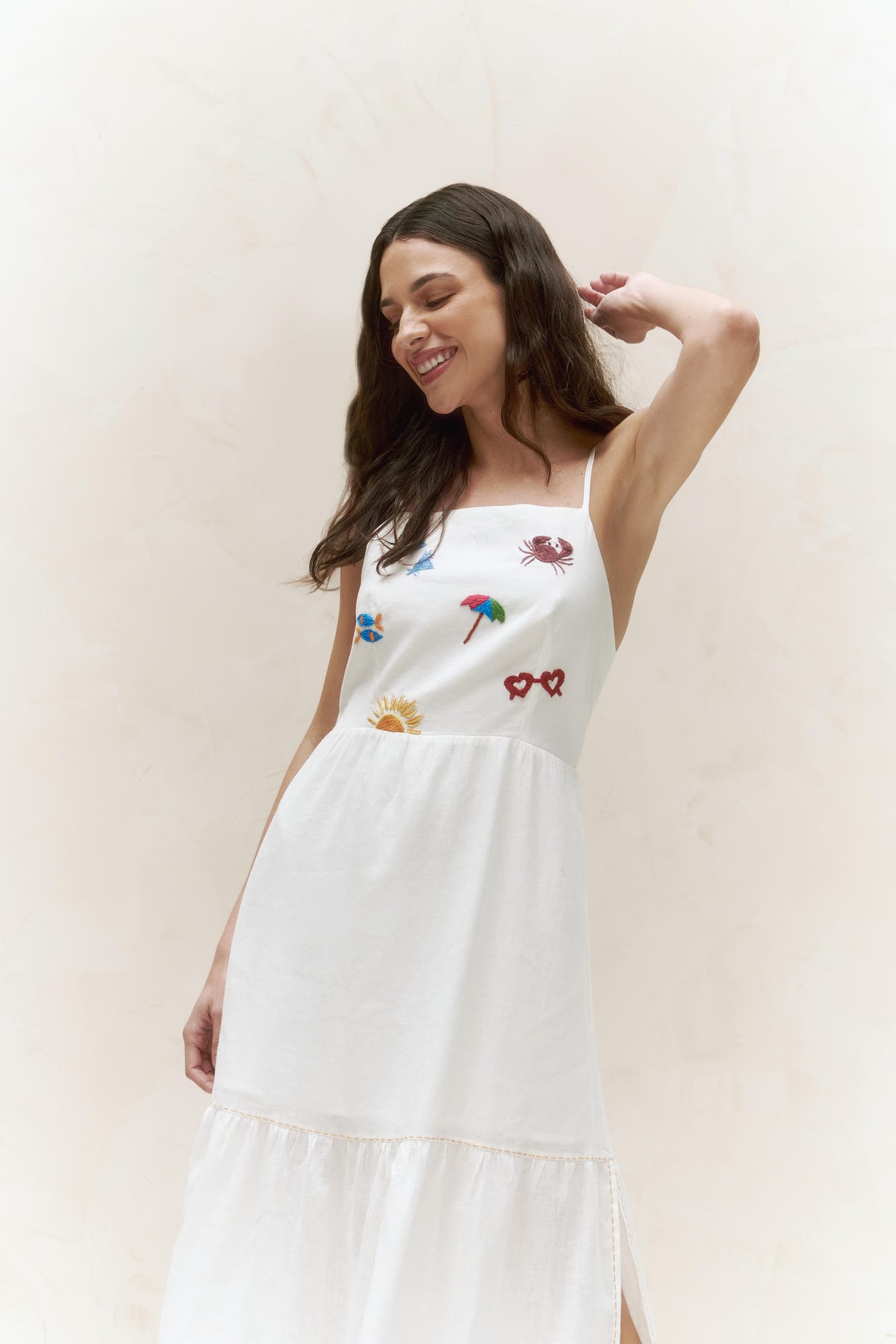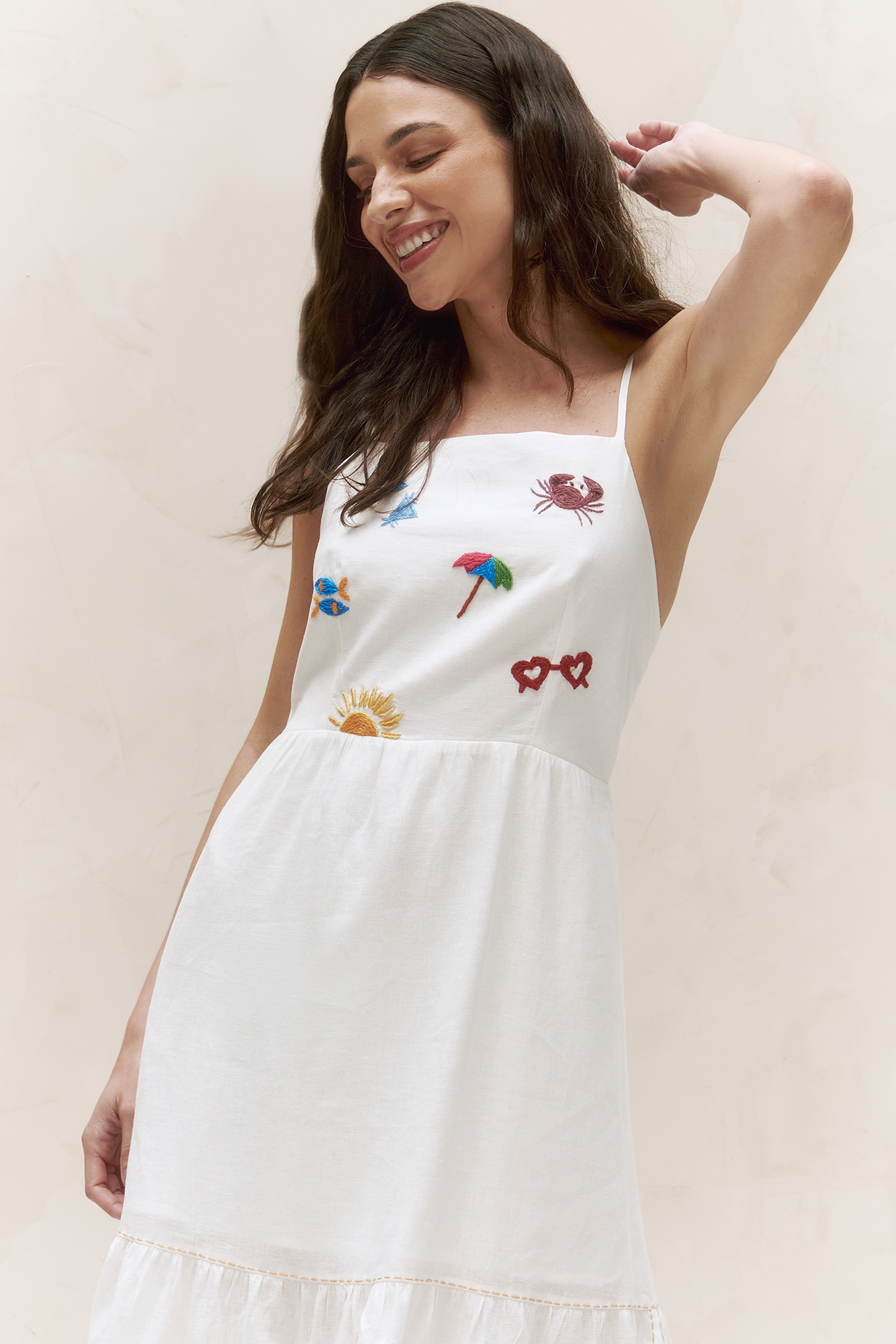 Vestido midi em cambraia de linho com viscose, com alças reguláveis e lastex nas costas que garantem perfeito ajuste e conforto. Com bordado manual de motivos praianos, que expressam o charme artesanal e a leveza do verão carioca.