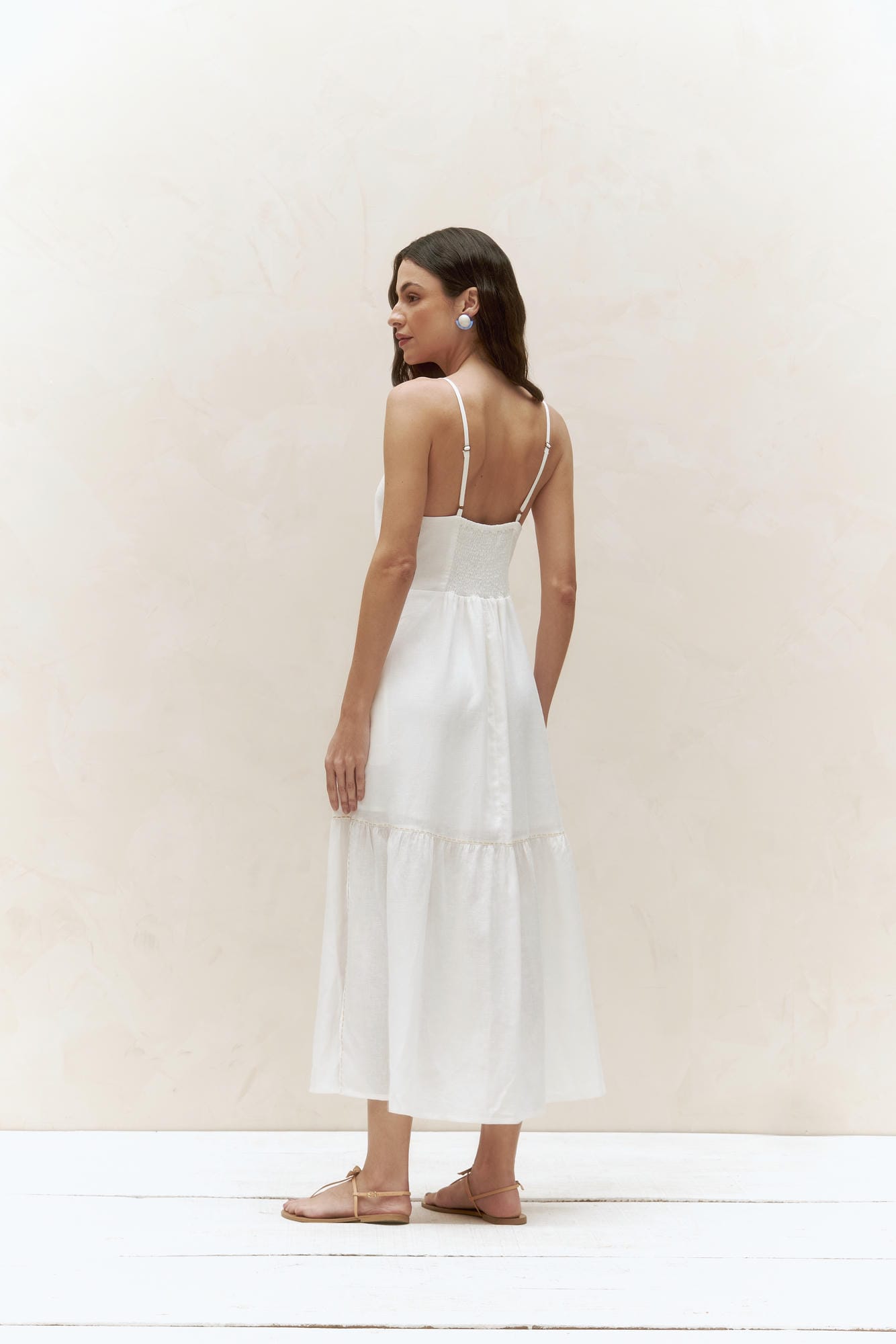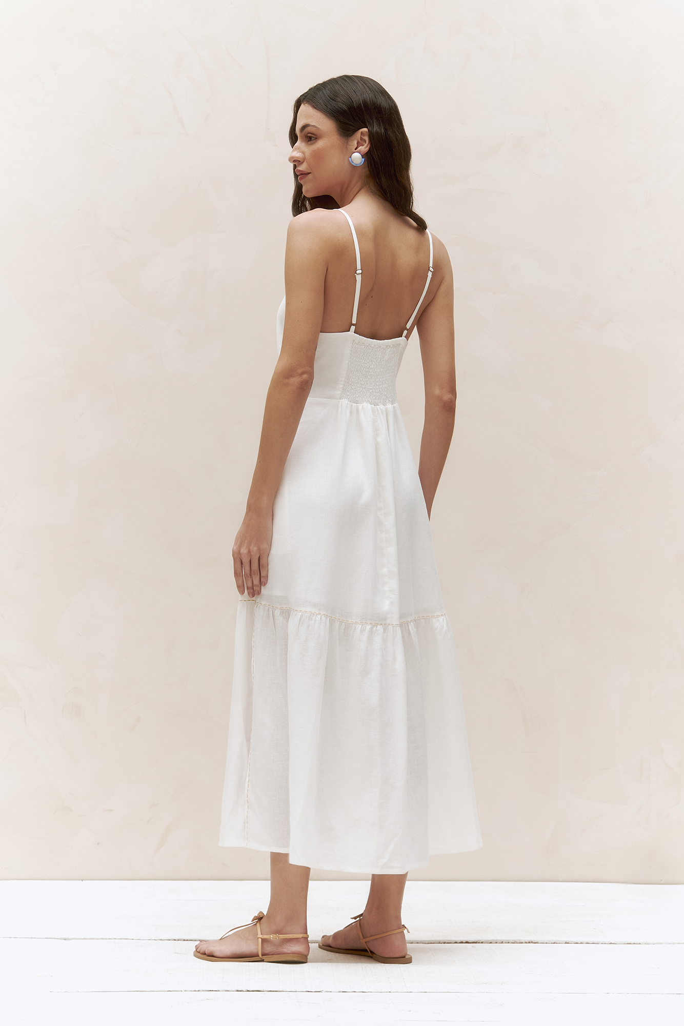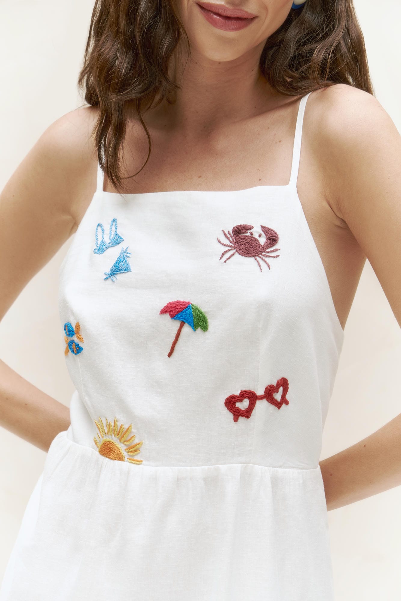 Vestido midi em cambraia de linho com viscose, com alças reguláveis e lastex nas costas que garantem perfeito ajuste e conforto. Com bordado manual de motivos praianos, que expressam o charme artesanal e a leveza do verão carioca.