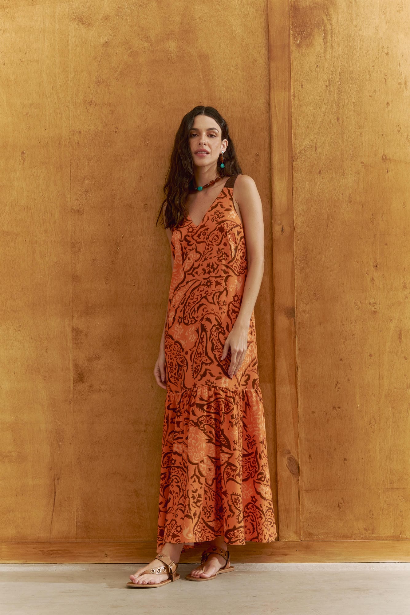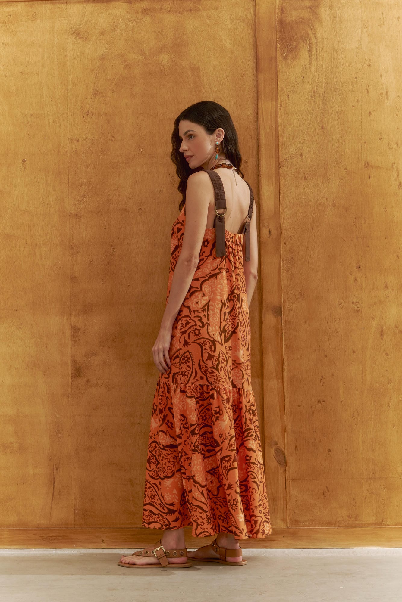 Vestido em linho com viscose e estampa exclusiva inspirada nas paisagens quentes e vibrantes da savana. Alças de elástico forradas em tecido contrastante, que além de trazer um detalhe moderno, possuem regulagem para melhor ajuste ao corpo.