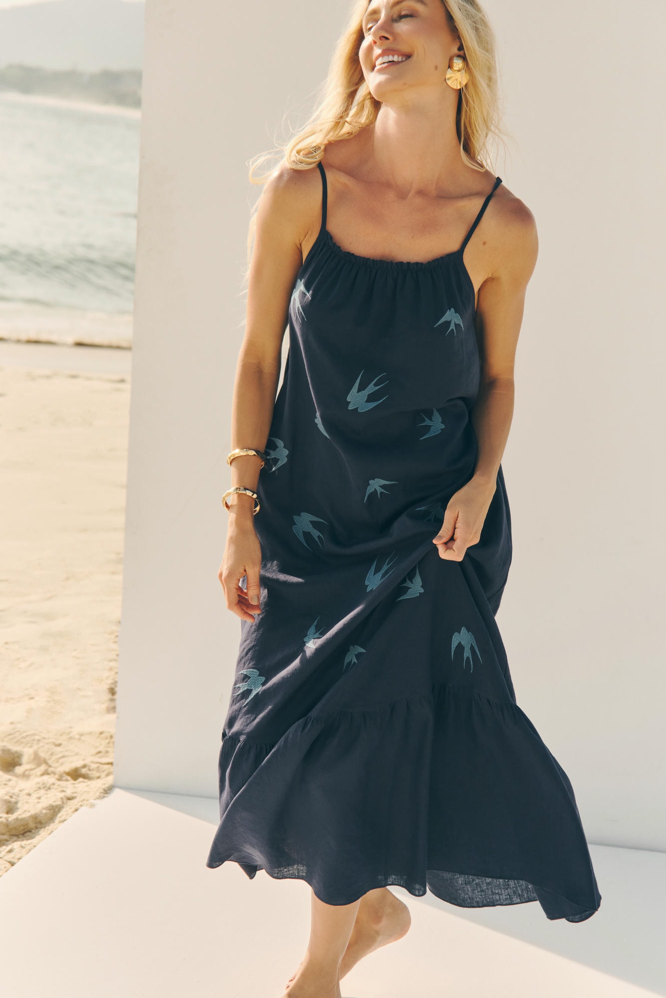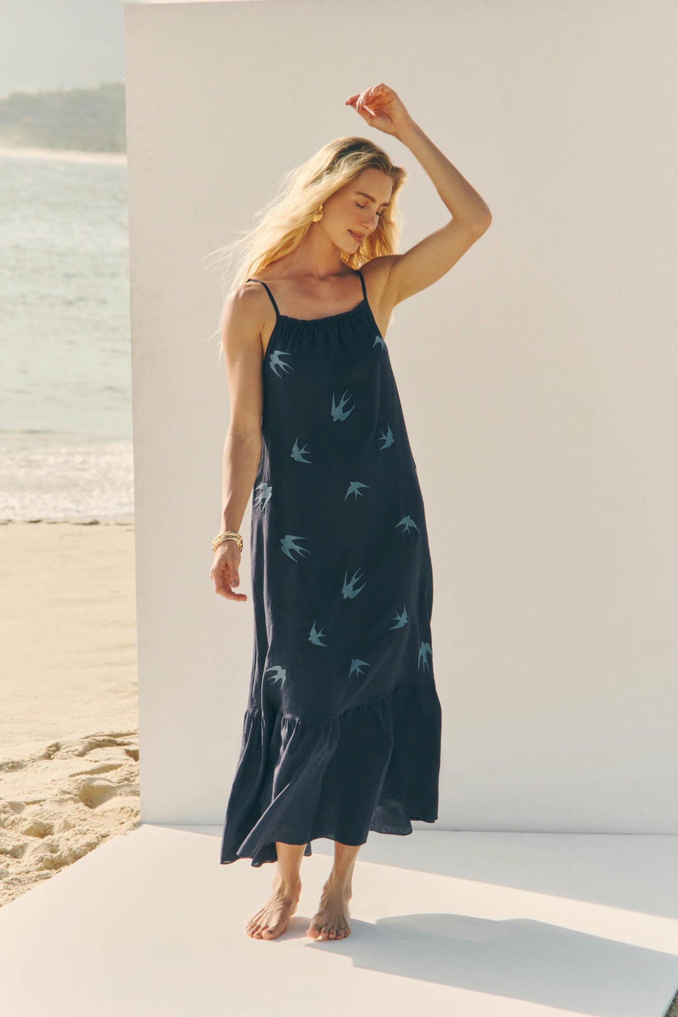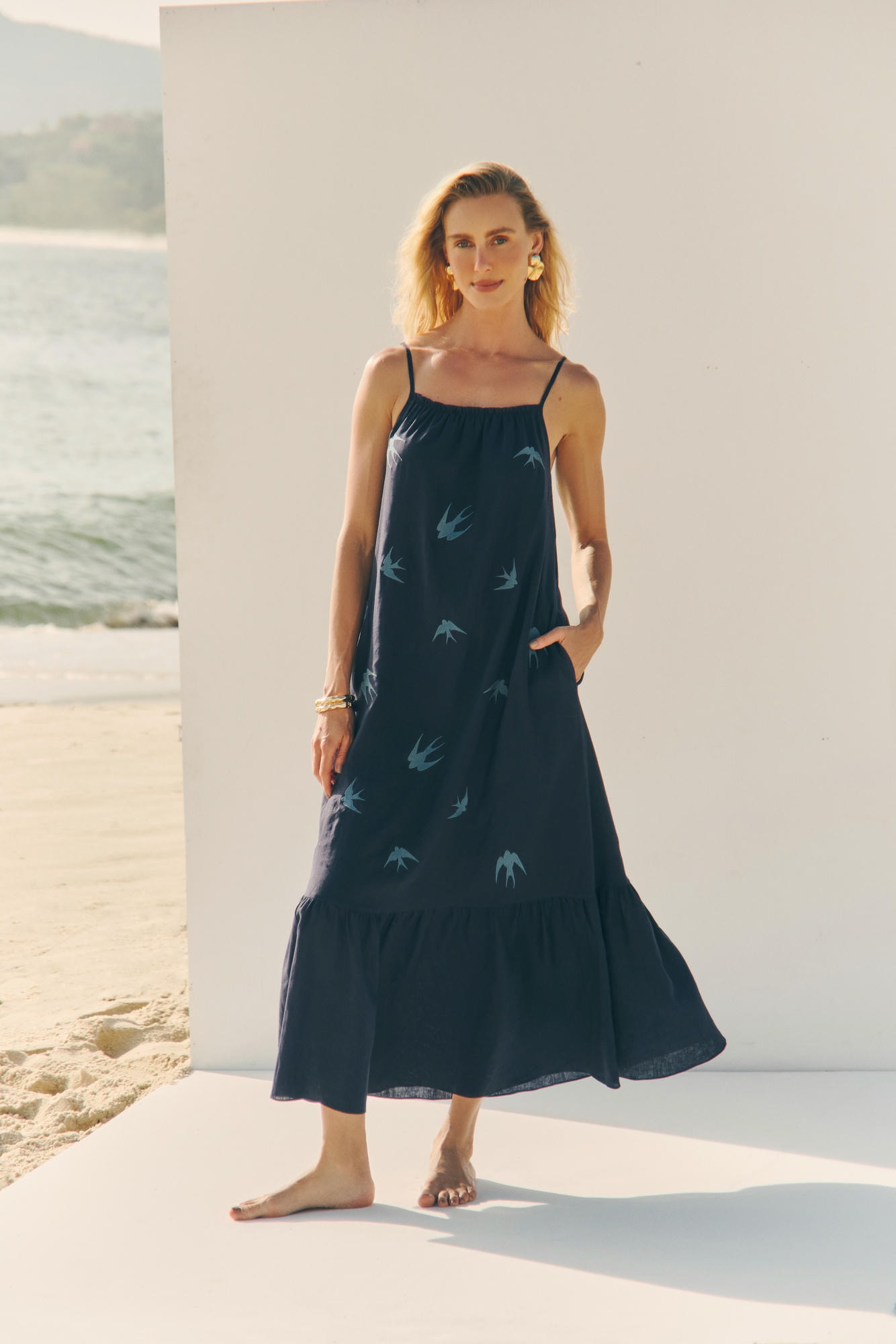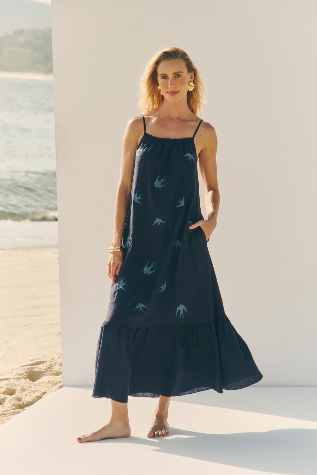 Vestido midi de modelagem solta, com caimento leve e fluido que garante conforto e elegância. O bordado delicado de andorinhas adiciona um toque original e poético à peça. Possui alças reguláveis. Versátil e atemporal é ideal para compor looks frescos e sofisticados do dia a dia a ocasiões especiais. Comprimento total aproximadamente 1,25cm.